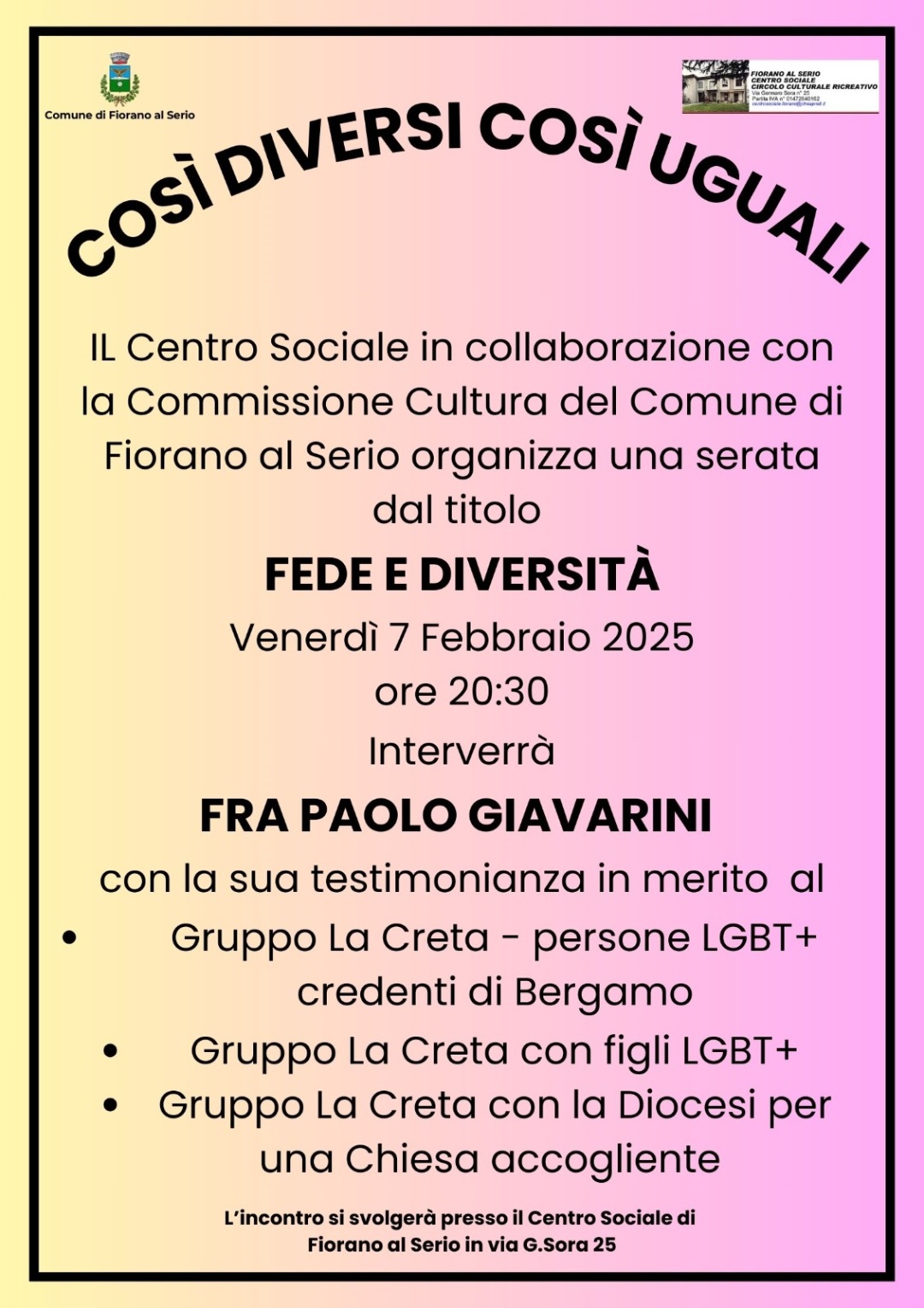 Primo incontro dal titolo "Fede e Diversità" - venerdì 7 febbraio ore 20.30 presso Centro Sociale di Fiorano